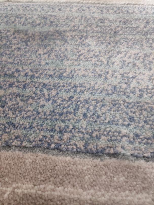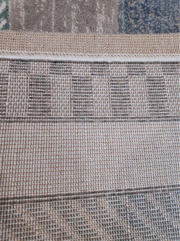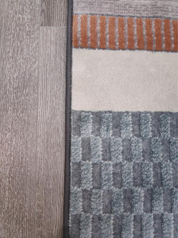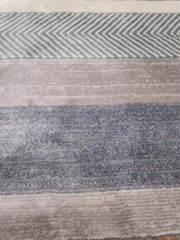 整体与细节先来一张整体图,这是拆开后半个小时左右的,仅有轻微的翘边了,毕竟是在生产以后就卷起来,到现在才第一次舒展开来,成果已经很傲人了。地毯至少有6种以上的颜色配色,花纹也至少有5种,一般多种颜色,多种纹理搭配会显得多少有点杂乱。但是这款地毯做到了非常高级的配色效果,整体蓝绿灰色为主,中间穿插跳脱的砖红色,大胆的撞色却不显得突兀。矩形,鱼骨纹,斜纹,横条,花灰,各种纹理搭配更是运用到了极致,随手一拍就是赏心悦目的画面。