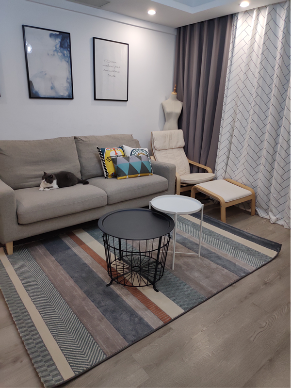 场景我家是北欧风,比较简洁,整个客厅基调偏灰。先来一张没有地毯的图片。看上去也还不错,但是总觉得少了些什么,显得有点单调。