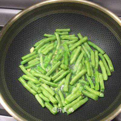 7、放入四季豆,稍炒片刻,倒入适量清水,盖上锅盖