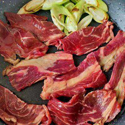 6、把煎好的葱扒拉到角落,煎一下牛肉片